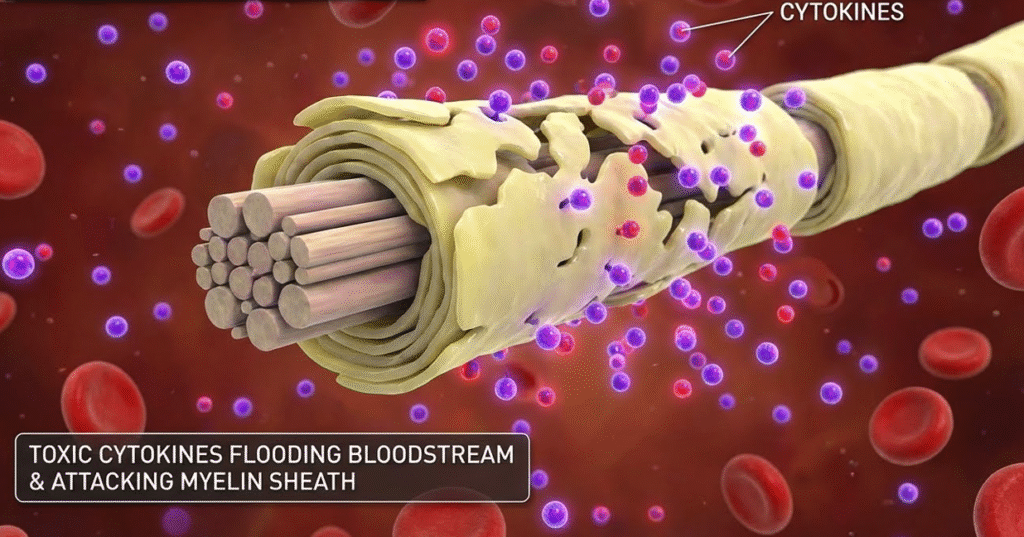 Toxic inflammatory cytokines flood the bloodstream and begin attacking the myelin sheath — the protective coating around your nerves.