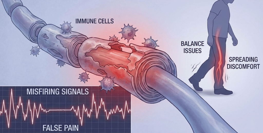 Nerves lose insulation, misfire constantly, and send false pain signals even when nothing is wrong.